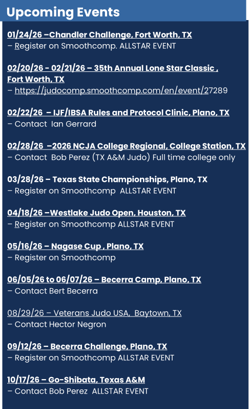 Texas has a number of judo competitions to choose from, with one tournament scheduled almost every month. Coming up first is the Chandler Challenge on January 24th 31st in Crowley, featuring the competition debut of Waco Judo, with Curtis representing in the adult novice division. Here is the schedule for the rest of the year:
